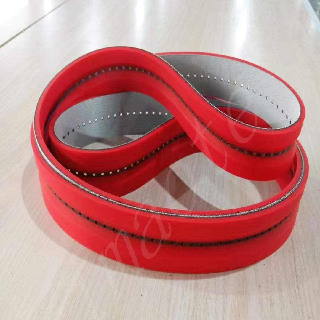 橡膠同步帶傳動是由一根內(nèi)周表面設(shè)有等間距齒形的環(huán)行帶及具有相應(yīng)吻合的輪所組成。它綜合了帶傳動、鏈傳動和齒輪傳動各自的優(yōu)點。轉(zhuǎn)動時,通過帶齒與輪的齒槽相嚙合來傳遞動力。 傳輸龍同步帶傳動具有準(zhǔn)確的傳動比,無滑差,可獲得恒定的速比,傳動平穩(wěn),能吸振,噪音小,傳動比范圍大,一般可達1:10。允許線速度可達50M/S,傳遞功率從幾瓦到百千瓦。傳動效率高,一般可達98%,結(jié)構(gòu)緊湊,適宜于多軸傳動,不需潤滑,無污染,因此可在不允許有污染和工作環(huán)境較為惡劣的場所下正常工作。 傳輸產(chǎn)品廣泛用于紡織、機床、煙草、通訊電纜、輕工、化工、冶金、儀表儀器、食品、礦山、石油、汽車等各行業(yè)各種類型的機械傳動中。橡膠同步帶的特點   (1)傳動準(zhǔn)確,工作時無滑動,具有恒定的傳動比;  (2)傳動平穩(wěn),具有緩沖、減振能力,噪聲低;  (3)傳動效率高,可達0.98,節(jié)能效果明顯;  (4)維護保養(yǎng)方便,不需潤滑,維護費用低;  (5)速比范圍大,一般可達10,線速度可達50m/s,具有較大的功率傳遞范圍,可達幾瓦到幾百千瓦;  (6)可用于長距離傳動,中心距可達10m以上。橡膠同步帶傳動的主要失效形式  ①帶體疲勞斷裂;   ②帶齒剪斷和壓潰;   ③帶側(cè)、帶齒磨損、包布剝離;   ④承載層伸長、節(jié)距增大、形成齒的干涉、爬齒;  ⑤沖擊、過載使帶體斷裂。